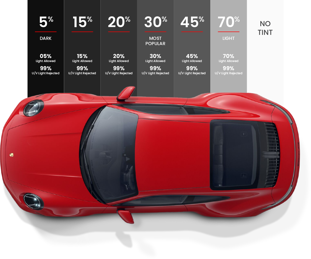 The deep graphite tone UV stable of Ceramic automotive windows film is offered in six VLT levels.